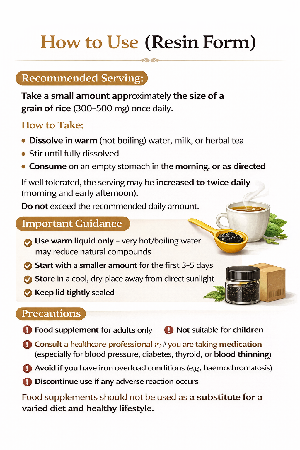 Take a small pea-sized portion (approx. 300–500mg) and dissolve in warm water, tea, or milk. Use once daily.